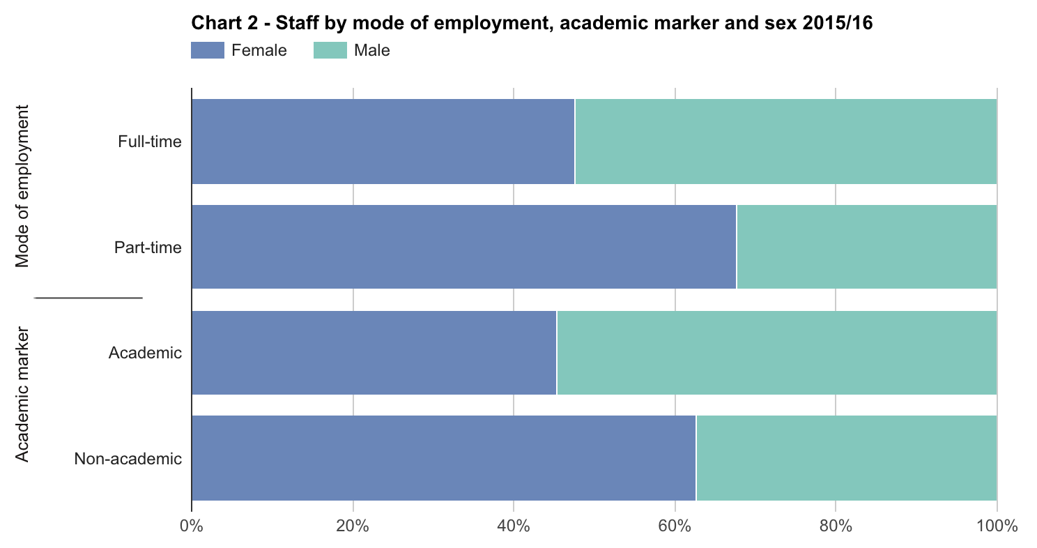 Approximately 45 per cent of the 201,380 academic staff working at UK universities are female, a figure that remains unchanged on 2014-15. Women comprise 68 per cent of part-time workers and 63 per cent of those on non-academic contracts.