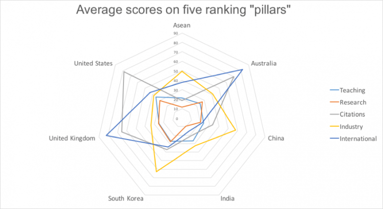 For instance, the new analysis shows how the nations of South East Asia are building a successful regional higher education network centred around the cross-pollination of research and student movement. This graph, which shows how members of the Association of Southeast Asian Nations (ASEAN) compare on average “pillar” scores in the ranking with major countries, provides a taste of this data.