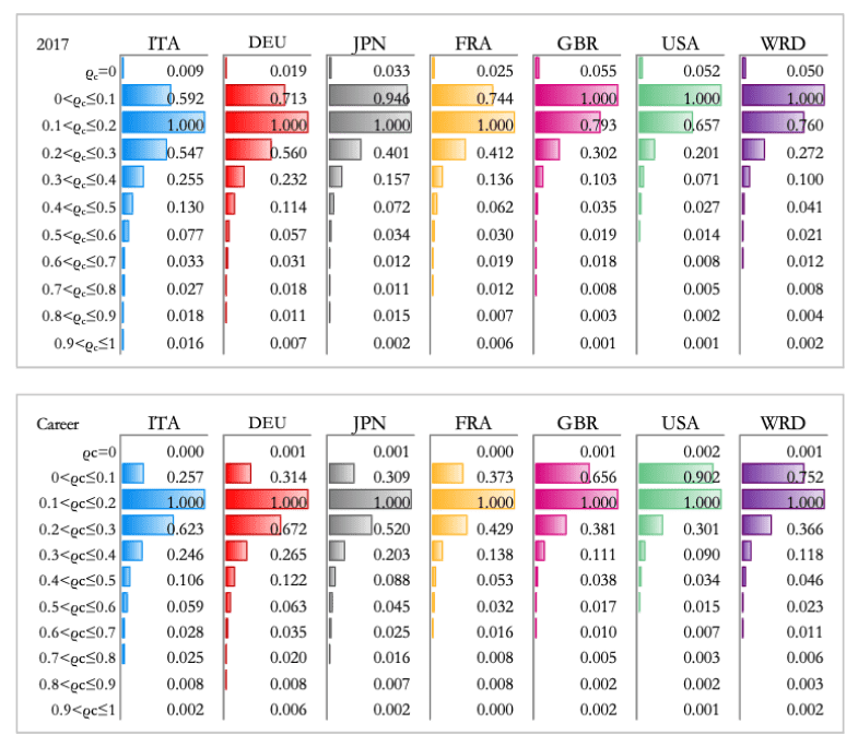 Figure 2: an increase in the presence of Italians in the top 100,000. Looking at the world data (WRD) we can see how practically all US, GBR, FRA, JPN, DEU losses were absorbed by ITA, CHN, IND
