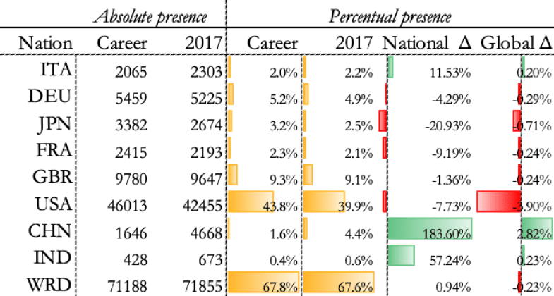 However, we also noticed in this exercise that, perhaps more importantly, of all the countries we analysed, with the exception of Italy, China and India, there has been a decline in the number of researchers present in the 2017 Ioannides data set compared to 22-year career data (Japan was down 20 per cent nationally, for example). Italy is in fact showing an opposite trend, 0.2 per cent increase on a global basis and an impressive 11.53 per cent gain on a national basis (figure 2). The advancement of China and India is also impressive, registering a frightening (albeit expected) 284 per cent increase and 152 per cent growth respectively between the larger data set and 2017 alone.