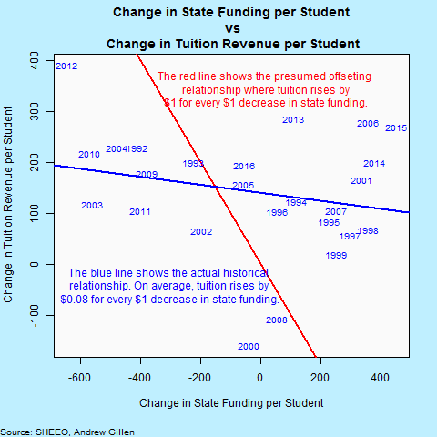 For instance, a recent State Higher Education Finance report documents that for fiscal year 2016, total revenues per student at public colleges was roughly $13,000, composed of about $7,000 in state funding and $6,000 in tuition revenue. If state funding falls by, say, $2,000 per student, then state funding would only be providing $5,000 of the $13,000 total, so tuition revenue would need to increase by $2,000 to $8,000. While this theory is on solid theoretical ground, it runs into two empirical problems.