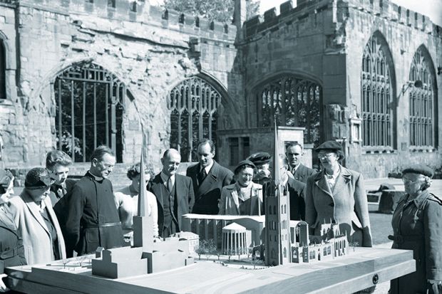 A model of Sir Basil Spence’s new cathedral for Coventry displayed at the ruins of the old medieval cathedral that was destroyed in the Blitz