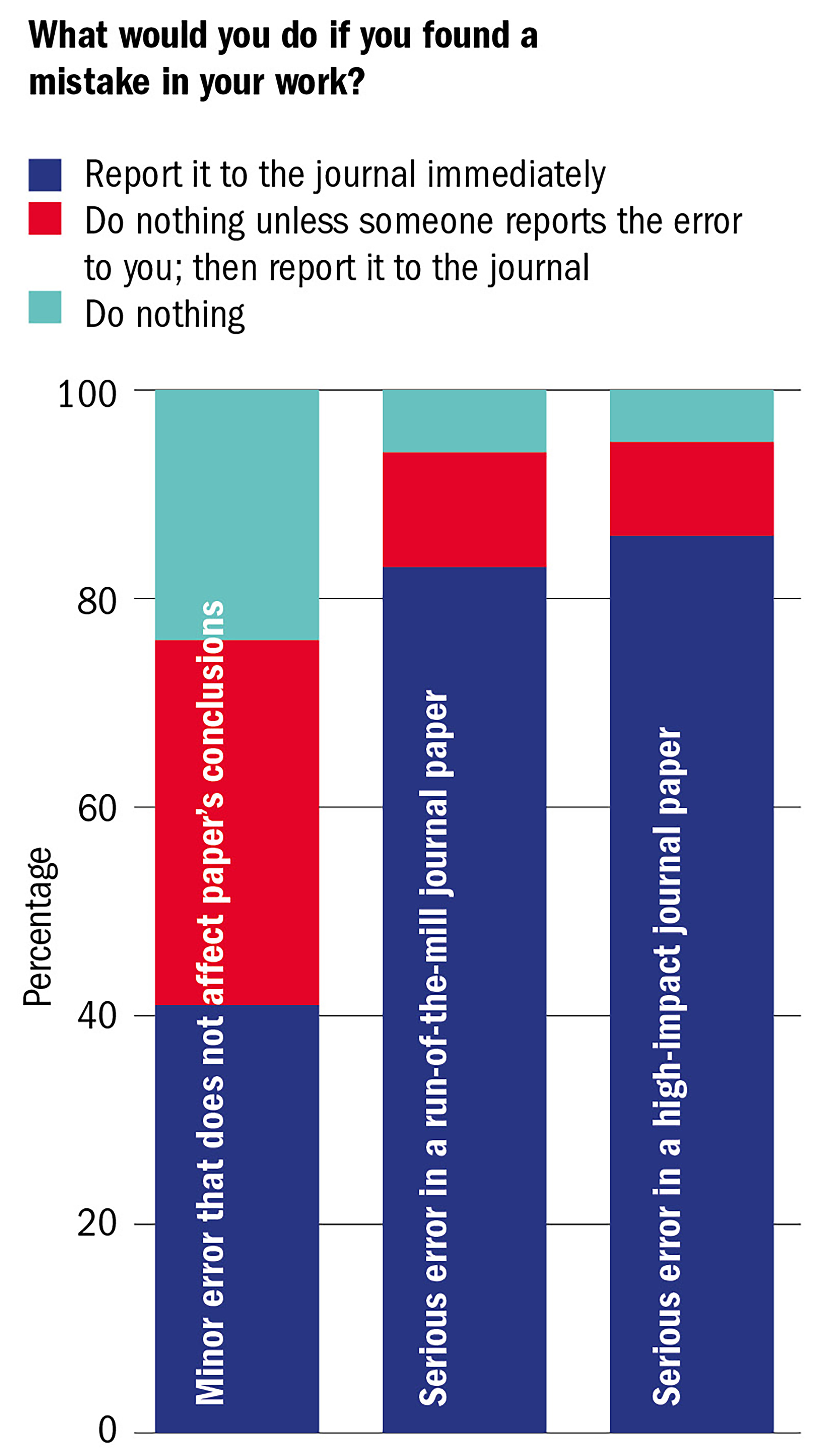 Of the 220 respondents, 86 per cent said that they would immediately report a serious error that affected the conclusions of work they had published in a high-impact journal. Just 5 per cent would do nothing, and 9 per cent would do nothing unless someone pointed out their error.