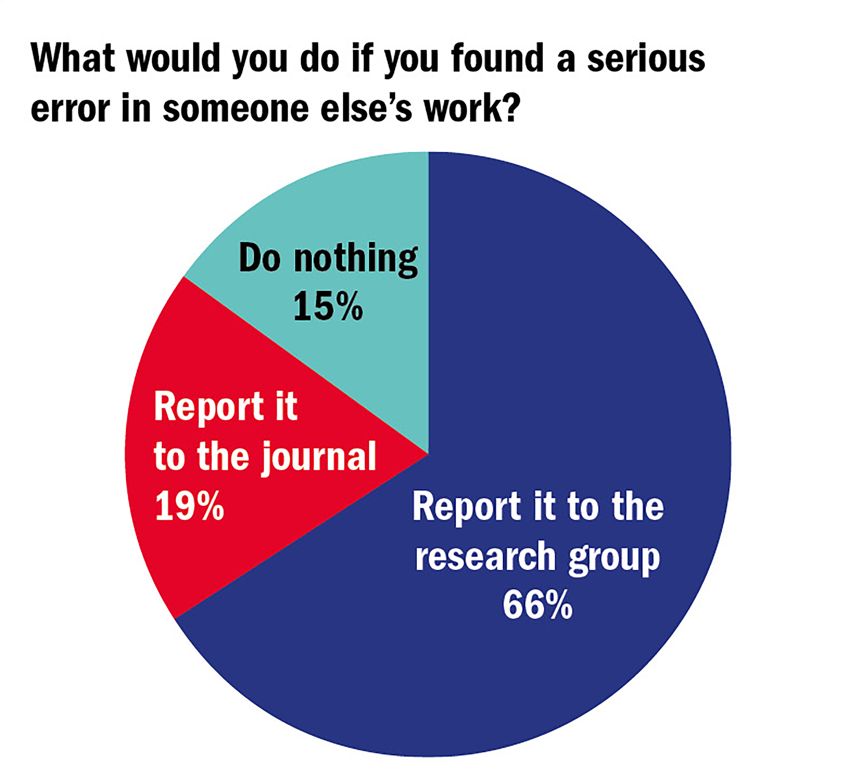 Those who took part in the poll seemed much keener to point out slip-ups by their peers. Two-thirds would report a serious error that they found in another group’s paper to the researchers that authored it, and a fifth would tell the journal immediately.