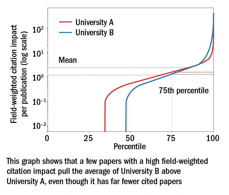 A few, very highly cited papers can raise the score of a university significantly without being typical of that university’s output. If those papers drop out of the time period we analyse (each edition of the ranking analyses publications indexed over the previous five years), a university may see significant changes to its score from one year to the next.