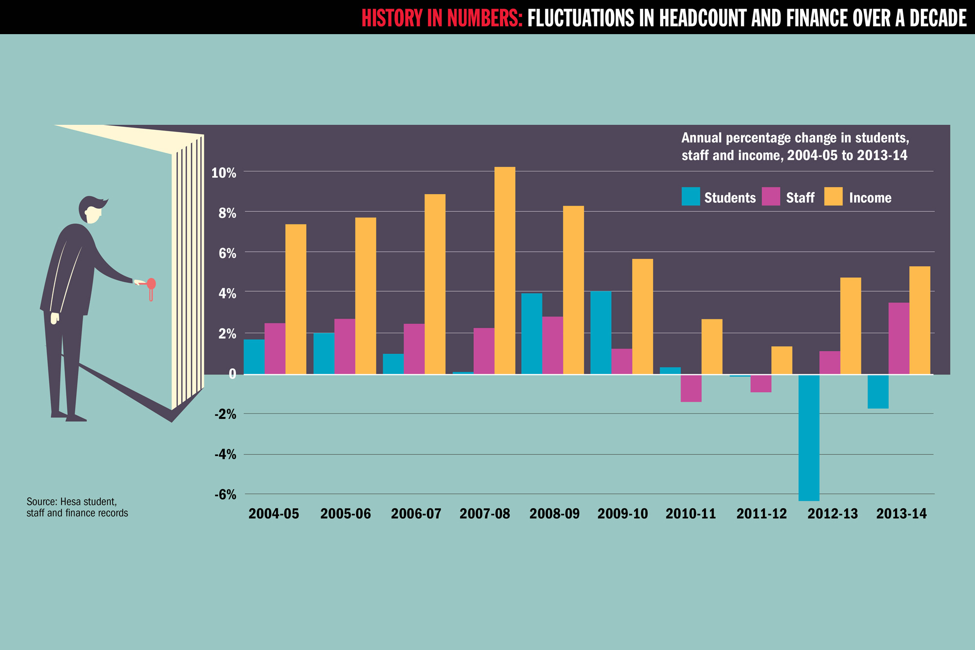Print headline: History in numbers: fluctuations in headcount and finance over a decade