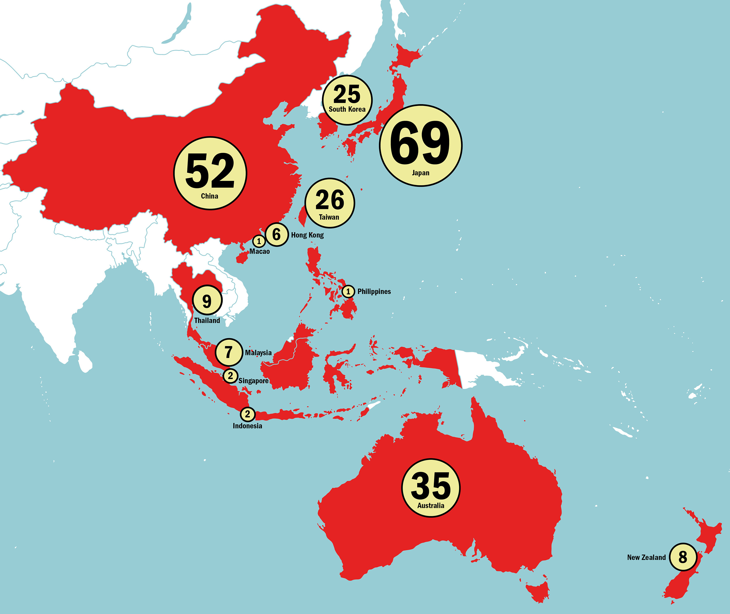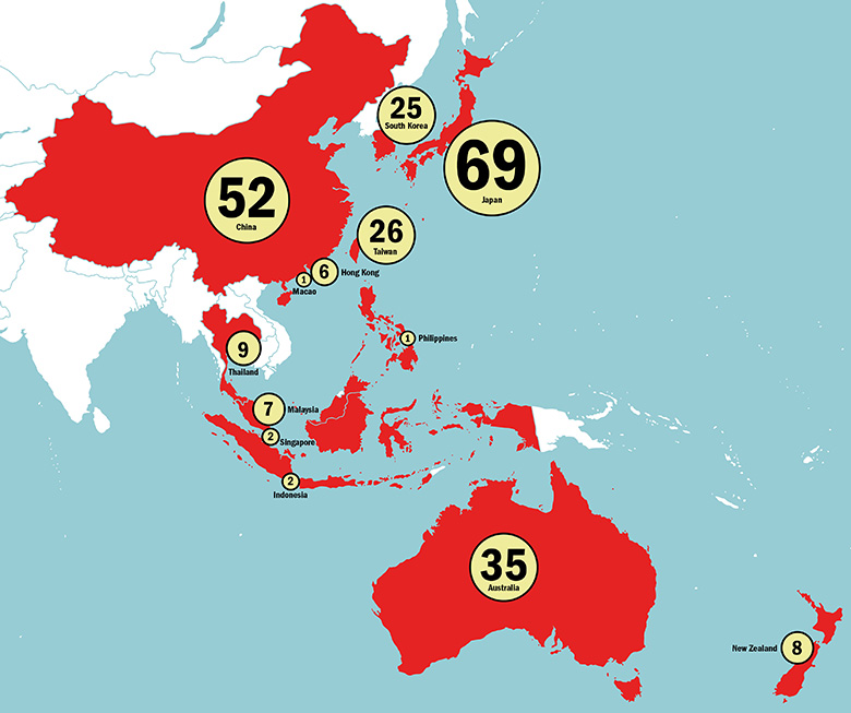 The figures in the circles are the number of universities in each country or region; the sizes of the circles are proportionate to the number of universities