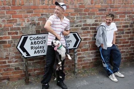 Two British boys with a Staffordshire Bull Terrier