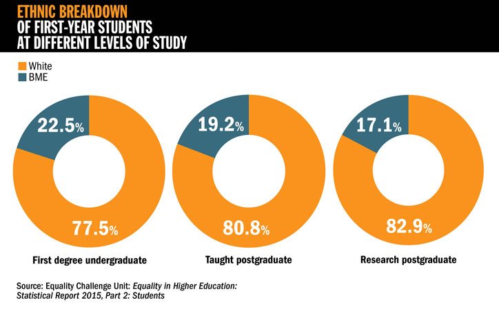 The latest ECU data lay bare the extent of ethnic minority under-representation in the academy. Some 22.5 per cent of all first-year undergraduates are from ethnic minorities – although that falls to 19.2 per cent of first-year taught postgraduates and 17.1 per cent of first-year research postgraduates (see graphs, above). In comparison, the academic body was roughly three times as white as the first-year student cohort, with 8.2 per cent of academics and 7.3 per cent of professors identified as BME.