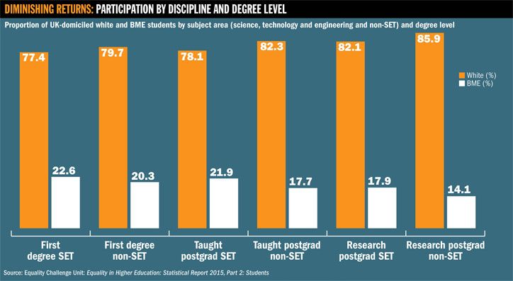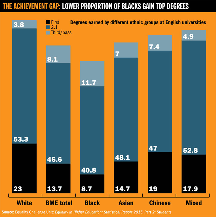 The drop-off between the undergraduate and the postgraduate level is particularly sharp among black students, who account for 7.3 per cent of first-year, first-degree undergraduates but only 3.6 per cent of starting research postgraduates. So why are relatively few black students making it through to higher study? According to Elizabeth Opara, associate professor in Kingston University’s Faculty of Science, Engineering and Computing, one major reason is lower average degree attainment by minority students, particularly black ones. According to the latest ECU data, 76 per cent of white undergraduates in England get a first or a 2:1, compared with 60 per cent of BME students overall – and just 50 per cent of black students. Nearly a quarter of white students (23 per cent) in England gain a first, but less than a tenth (9 per cent) of blacks do – a total of 1,595 in 2013-14 (see graph on page 39).