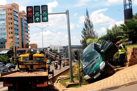 This is not to say that life is not here in this exhibition – it surely is, and the Rwanda we see is vital, populated and preoccupied, time and again. John Mbanda’s fruit-seller is caught in the foreground of a market scene, lurching into a blurred shot, bearing on her head a basket piled high with green mangoes, for ever on the cusp of toppling over – bright, lucid and vivid. Similarly, Yves Manzi’s sequence of landscapes juxtaposes the colour of local fauna with the sharp angles of contemporary architecture, purple bougainvillea clustering behind gleaming aluminium huts and sloping red fibreglass roofs – the mixed materials somehow perfectly expressive of a Rwanda rising from the rubble, ambitious and resourceful. Even Cyril Ndegeya’s curiously fixated series of road traffic accident scenes – all askew trucks, upturned motorcycles, averted gazes and blood-strewn roads – patiently document the rough and rushed life of a city that could be any city.