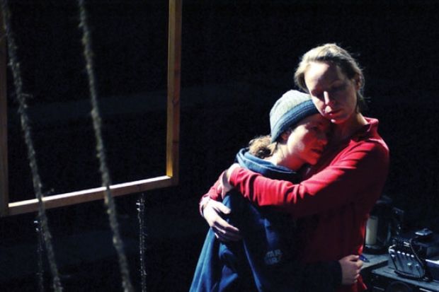 No man is an island, but these two women appear to be one. Insulated from the outside world, in a panic room of their own, they pass from anxiety at their predicament to painful probing - visceral and violent - into a past more shared than Fay would like. She's cuckquean of all she surveys. For Jacq, the spectre of inappropriate conduct overlaid by homophobia waits at what's left of home, while ahead is the wide Atlantic that will separate the lovers should Fay, spitting feathers but not yet ready to fly, ever make it to her fellowship. Superb performances from Boyack and Leer, playing the stranded lovers with fire and ice, make the audience forget that their seats have no backs, only edges, like the dialogue. Outside the actors' cramped quarters, in-the-round in the crucible of the Citizens Theatre's upstairs studio space, we see through both ends of the telescope: apocalypse now in the recriminations and revelations of the relationship-wrecked lovers; Armageddon beyond in the shrieking gulls and crashing waves.
