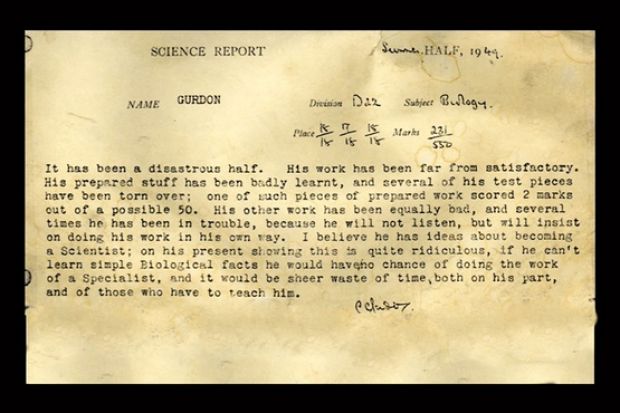 At the age of 15, at my boarding school, I was given my first term of science. The master used to dictate facts that we had to note down because, in 1947, there were no textbooks. I had not been taught to take notes, and failed all the frequent tests, ending up bottom of the bottom form of a year group of 250 pupils - in biology. Hence the report of the schoolmaster, which still sits above my desk at the Gurdon Institute. It said: “It has been a disastrous half. His work has been far from satisfactory. His prepared stuff has been badly learnt, and several of his test pieces have been torn over; one of such pieces of prepared work scored 2 marks out of a possible 50. His other work has been equally bad, and several times he has been in trouble, because he will not listen, but will insist on doing his work in his own way. I believe he has ideas about becoming a Scientist; on his present showing this is quite ridiculous, if he can’t learn simple Biological facts he would have no chance of doing the work of a Specialist, and it would be sheer waste of time, both on his part, and of those who have to teach him.”
