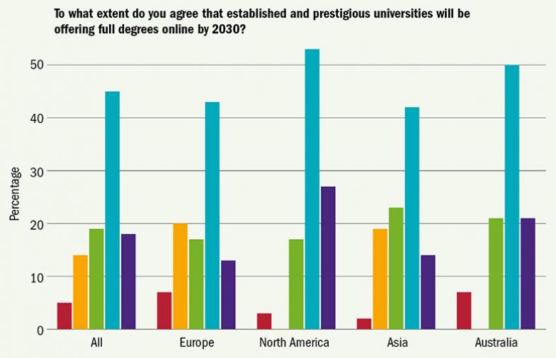 On the whole, our respondents – who hail from 45 countries across six continents – are sceptical that digital learning will supplant face-to-face learning any time soon. Although 63 per cent believe that established and prestigious universities will be offering full degrees online by 2030, compared with just 19 per cent who do not, only 24 per cent believe that online degree courses will be more popular than campus-based ones by 2030, against 53 per cent who disagree. And only 19 per cent think that digital technology will have eradicated physical lectures by 2030, compared with 65 per cent who disagree.