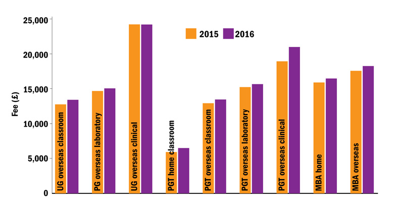 Institutions were asked to provide a typical fee, although some chose to provide a range. Figures are for guidance only. Fees for specific courses may vary from those shown. The averages exclude institutions that provided a range.