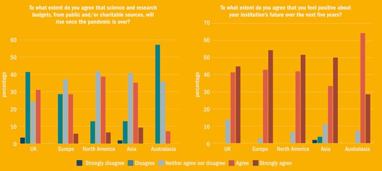 The change of mood in North America may be a result of the inauguration of Joe Biden as US president, whose first few months in office were marked by large spending pledges on higher education and research. But even in North America, optimism about research funding has declined since last year – though not as much as elsewhere. This has allowed North America to overtake the UK as the most optimistic region about research funding, amid doubt that the UK’s research spending pledges would be confirmed in this week's spending review. In North America, 45 per cent of respondents expect research funding to rise over the next five years, against 13 per cent who do not.