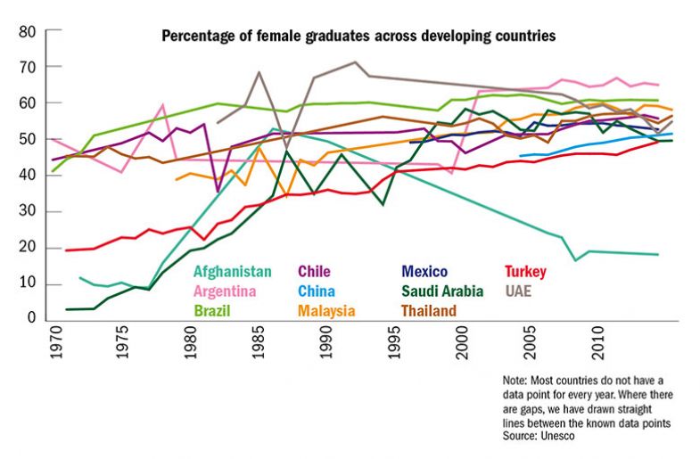 Similar factors could partly account for the gender disparity among students in other countries: even those in which discrimination against women is common. According to the World Economic Forum, the United Arab Emirates, Syria and Lebanon are among the worst nations for gender equality, yet women make up 55 per cent of the most recent recorded graduate cohort in the UAE and Syria and 56 per cent in Lebanon.