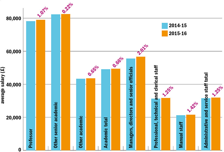 However, breaking down the pay data at a sector-wide level starts to reveal slightly differing patterns among different job types. Average pay for professors in the UK, for instance, rose by 1.1 per cent to £79,030 in 2015-16. But when considering everyone on an academic contract, average pay went up only 0.7 per cent, to £49,408.