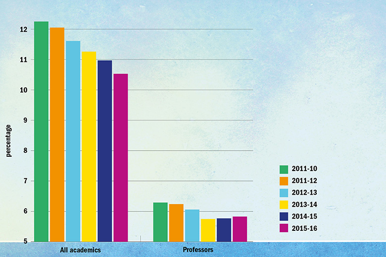 While the earnings of rank-and-file university staff are always a major bone of contention, the other issue that has dominated the pay agenda in recent years is the gap between the salaries commanded by men and women. So what do the Hesa data reveal about how well universities are addressing this problem? At first glance, the picture is mixed: the closing of the gender pay gap at the professorial level appears to have stalled. It nudged up very slightly in 2015-16 to 5.83 per cent after also rising the year before. But the pay gap between male and female professors is still smaller than that for academics overall: the latter figure was 10.5 per cent in 2015-16, meaning that women’s average salary was 89.5 per cent of men’s. But the gap across all ranks of academics has been continuously falling since 2010-11, when it was 12.3 per cent.