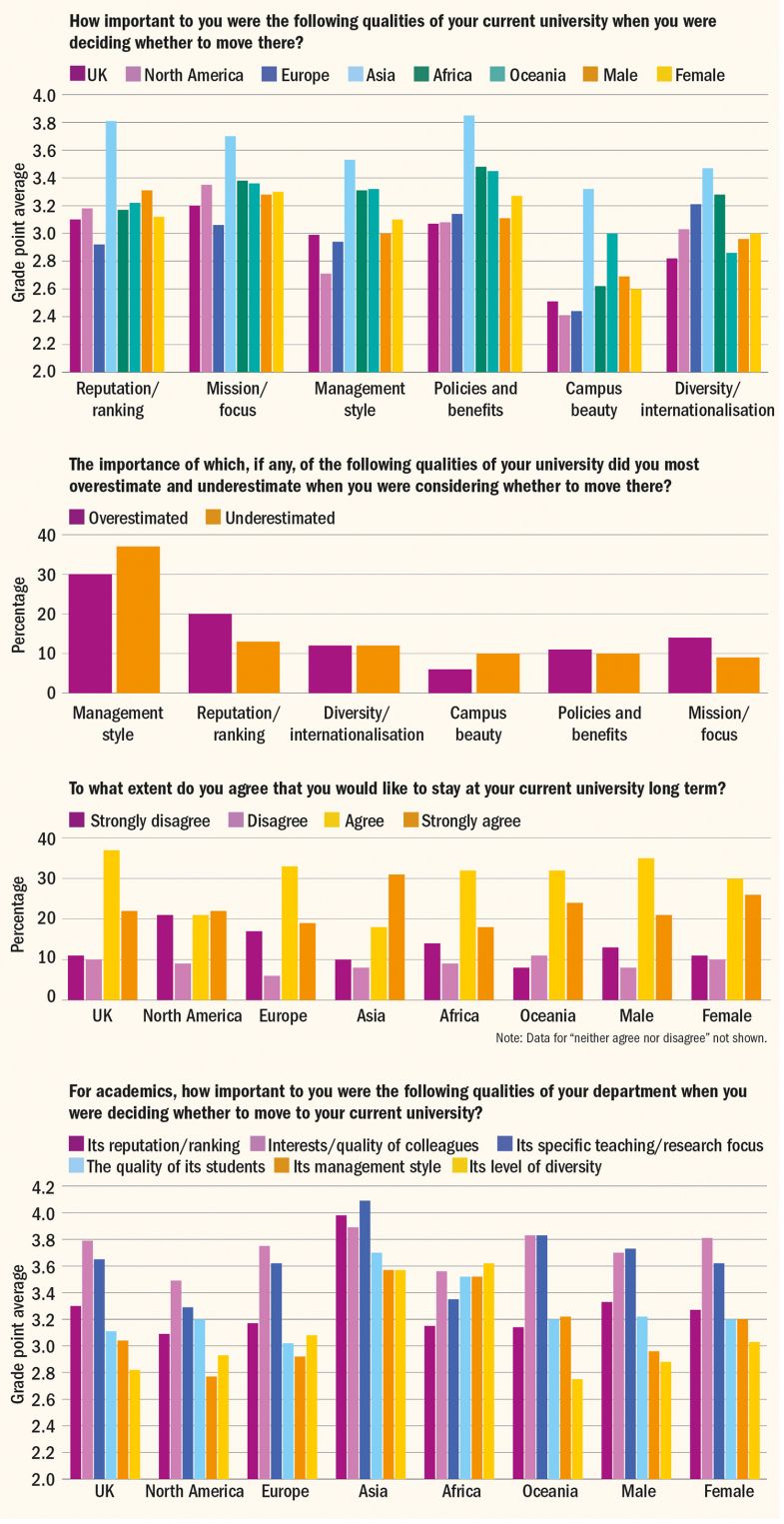 For academics affiliated with particular departments, the interests and quality of their colleagues is the most important pull factor (with a GPA of 3.76), followed by its specific teaching or research focus (3.65) and, some distance behind, its reputation or ranking (3.29) and quality of its students (3.19).