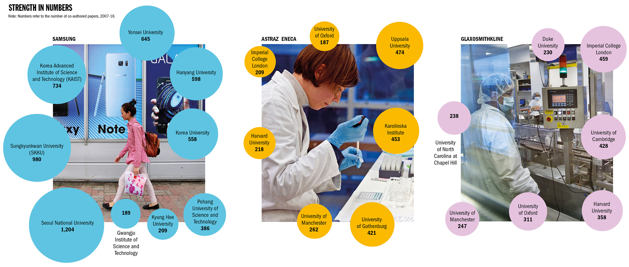 Volvo Cars is no longer Swedish-owned or even US-owned: China’s Zhejiang Geely Holding Group bought it from Ford in 2010. The strength of Asian companies’ involvement in research is reflected in the first of Clarivate’s tables, which is dominated by South Korean universities publishing in collaboration with Samsung, the Korean multinational electronics conglomerate that also incorporates firms such as Samsung Heavy Industries and Samsung Life Insurance. Such collaborations take up seven of the top 14 places, accounting for between 2 and 5 per cent of those universities’ total research outputs.