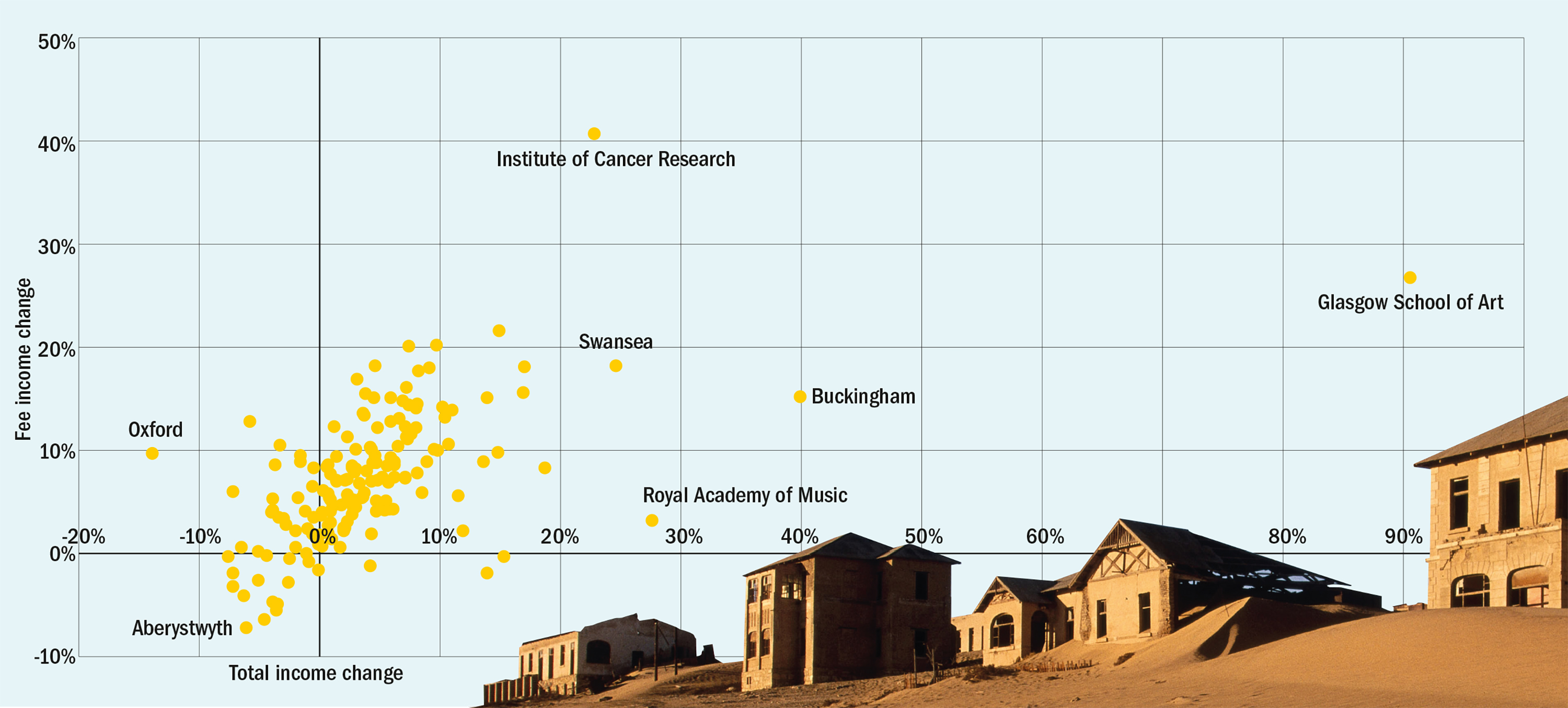 Institutions’ real-terms fee income v total income change, 2014-15 to 2015-16, graph large