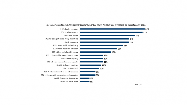 Students were asked which three SDGs are their highest priority. Students showed that they cared about all SDGs to some extent, with some given higher priority than others. From the student perspective, the highest priority SDGs proved to be SDG 4 – quality education – at 33 per cent, closely followed by SDG 13 – climate action – at 32 per cent.