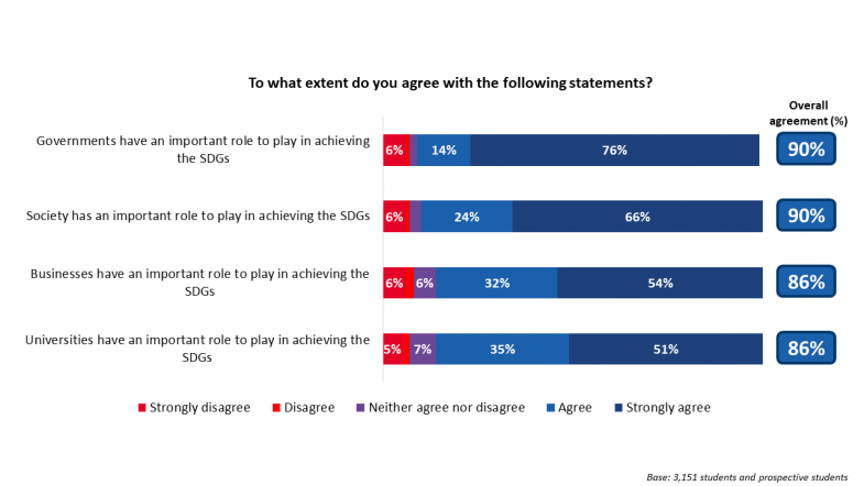 The survey aimed to gain an understanding of students’ opinions on the role of universities in contributing to sustainable development. The majority of respondents – 86 per cent – felt that universities have an important role to play in achieving the SDGs. The same proportion of students agreed that businesses have an important role to play, and a slightly larger proportion of students – 90 per cent – felt that society and governments have an important role to play in achieving the SDGs. This emphasises the importance of universities’ contributions to sustainable development as much as any other actor, both for prospective and current students.