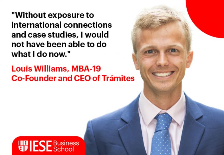 Louis Williams, who started his first business at 17, completed the MBA at IESE Business School in 2019. He has founded and been involved in several early-stage companies, including a service for schools to rent spaces to third parties, and a smart home technology business. His current business, Entre Tramites, employs 75 people and is a marketplace for Spanish businesses to source accountants, lawyers and bureaucracy assistants. “For me, the cross-border focus of the MBA was the most helpful aspect,” he says. “Without exposure to international connections and case studies, I would not have been able to do what I do now.”