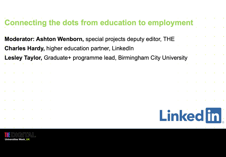 At a Digital Universities Week session, hosted by Times Higher Education in partnership with LinkedIn, Lesley Taylor, Graduate+ programme lead at Birmingham City University, and Charles Hardy, higher education client partner at LinkedIn, explored some of the resources and approaches universities can use to prepare their students for the job market.