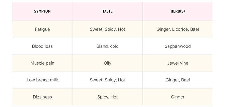 This herbal formula is aimed for mothers after childbirth. According to Thai medicine principles, postnatal women often experience fatigue, blood loss, muscle pain, low breast milk, and dizziness. Therefore, traditional Thai medicine practitioners often choose these five herbs with the following tastes and therapeutic properties to cure the symptoms: