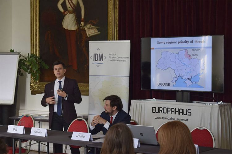 Mykola Nazarov presents research results during the security conference in Vienna, Austria
