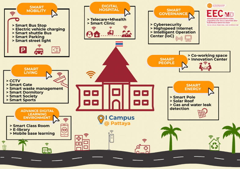 The future goal for Thammasat university, Pattaya campus, is to become Thailand’s first Medical Hub and become Smart City, Smart Campus, Smart Sport, and Digital Hospital using AI to perform digital tasks and be an i-Campus @Pattaya. The services to be created includes the smart bus stops, smart trash cans with sensor system, electric vehicles (EV) as public transportation, pure energy from solar roof and float solar cells, and finally, a paperless campus.