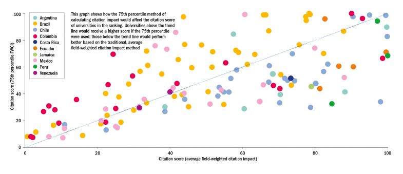 This alternative approach would produce much greater stability in our Latin America University Rankings in particular; universities in this ranking are even more susceptible to year-on-year changes in citation count as the table’s lower eligibility criteria mean that they need to publish only 200 papers in a five-year period (down from 1,000 in the World University Rankings).