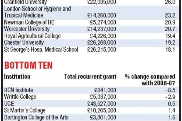 The total grant represents a 3.7 per cent real-terms funding increase compared with last year. But the good news was tempered by the revelation that some 22 institutions, including Middlesex and Nottingham Trent universities, would receive real-terms funding cuts.