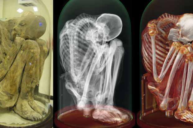 These pictures, which show a computed tomography scan of a Peruvian mummy, are part of an exhibition showcasing extraordinary images from biology and medicine. Visions of Discovery is being hosted by the University of Dundee and will run until January. Other images, all generated by biomedical research at the institution, include illustrations of cancer cells dividing, the structure of the skin and scans of the human circulatory system. Jenny Woof, reader in immunology at Dundee and organiser of the exhibition, said: “The images are not only visually attractive but also tell the story of the pioneering research going on in Dundee using state-of-the-art technologies.”