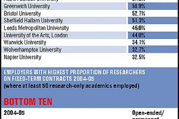 The universities of Teesside and London South Bank and the London School of Economics are bottom of the UCU table, with 100 per cent of research staff on fixed-term contracts in 2004-05.