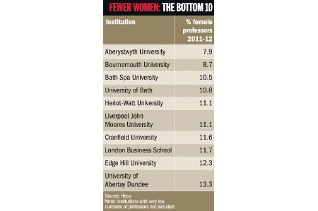 There were just six women among 77 full-time equivalent professors at Aberystwyth University (7.9 per cent) in 2011-12, according to data provided by the Higher Education Statistics Agency.