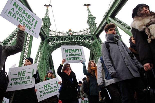 Minding the gap: students in Budapest protest cuts, bearing placards reading ‘Don’t take away our future’ (bottom left)