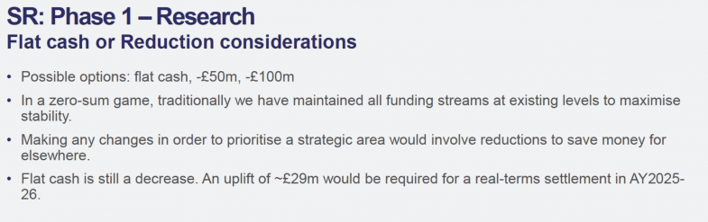 Even the best-case flat cash scenario was “still a decrease”, says the briefing, which explains an “uplift of £29 million would be required for a real-terms settlement in 2025-26”.