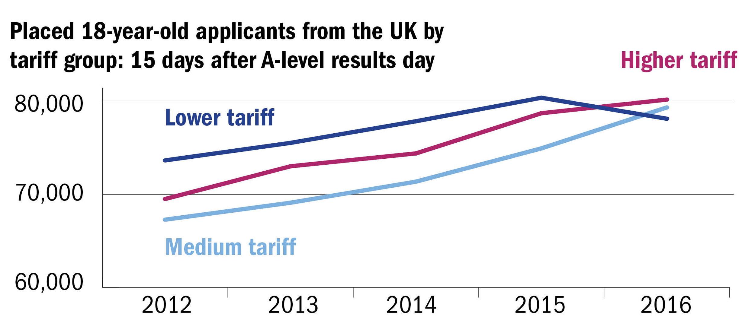 It is among 18-year-olds from the UK that the differences in recruitment trends are most pronounced. Ucas’ final set of clearing data shows a 2.8 per cent decline in enrolment at low-tariff institutions from this cohort, in contrast to a 5.9 per cent increase for middle-ranking providers, and a 1.9 per cent rise for elite universities.