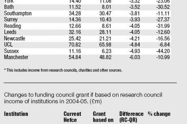Cranfield University would stand to earn millions of pounds more a year if block research grants were to be distributed on the basis of external research grants won by institutions. But Manchester University would see its funding coun cil grant cut by millions of pounds under such a system.