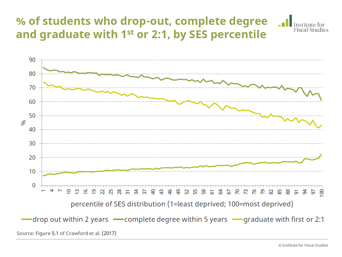 At the same time, those from poorer backgrounds are more likely to drop out or to gain a lower degree classification than more affluent students, said Dr Crawford, a research fellow at the Institute for Fiscal Studies.