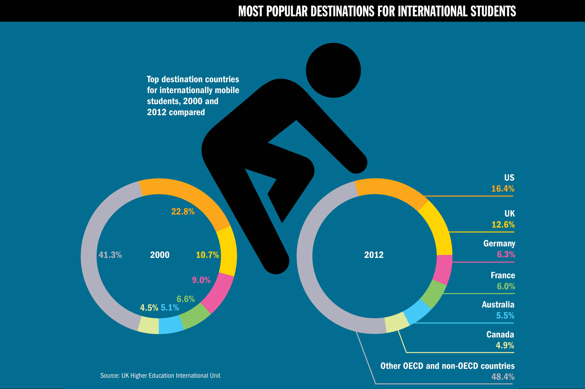 Although the proportion of international students heading for the US, France and Germany shrank, other countries registered gains between 2000 and 2012.