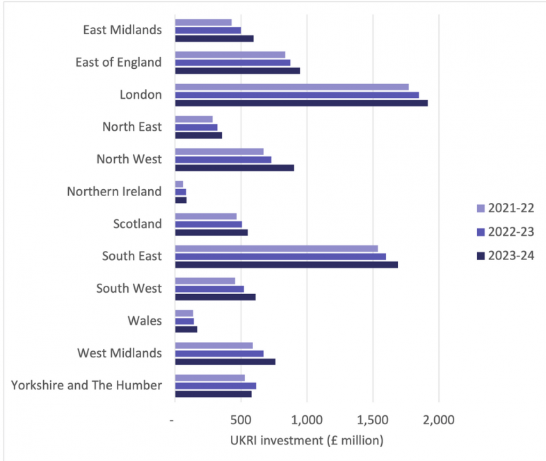 This increase was driven by significantly improved grant success in the east Midlands, west Midlands, the north-east and south-west, where UKRI income increased by more than inflation (13 per cent) between 2021-22 and 2023-24.