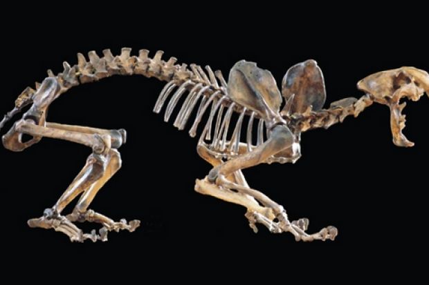 Although 10,000 years old, it is one of the younger fossils in the geology collection at the University of Bristol's department of earth sciences. The cat is accompanied by the skeleton of a green iguana, prepared at the department of anatomy. Although they can grow up to 1.5m long, such specimens have proved very useful in the training of veterinarians, who now often have to treat pet lizards.