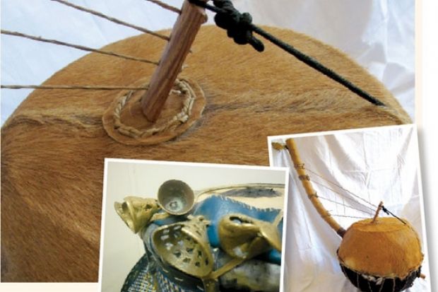This one was brought to Cardiff University by Amanda Villepastour, a lecturer in music who spent years travelling the world both as a musician (touring with the likes of Boy George and Billy Bragg) and as a curator and ethnomusicologist. She has assembled an impressive array of mainly African instruments, since African music is at the centre of her research interests. She is currently taking bolon lessons with a view to travelling to Conakry, Guinea's capital.
