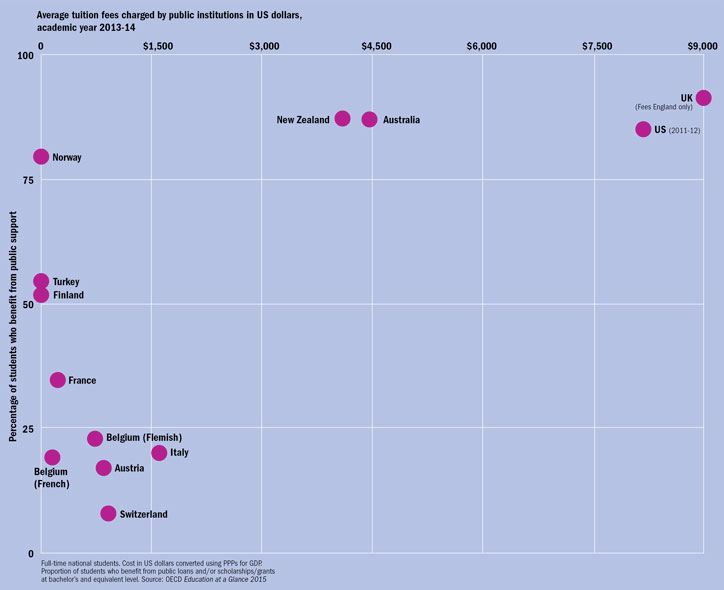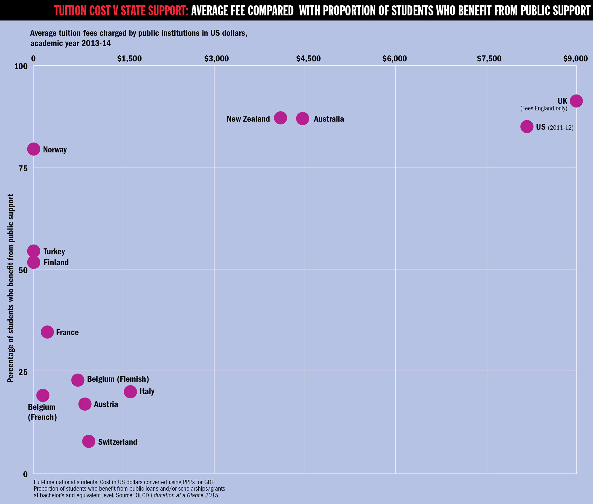 Tuition cost v state support: average fee compared with proportion of students who benefit from public support