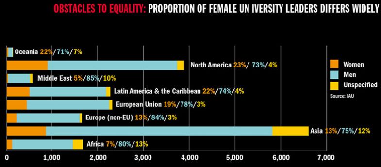 The portal also reveals wide disparities between regions. North America has the higher proportion of female university leaders – 23 per cent – compared with just 5 per cent in the Middle East.