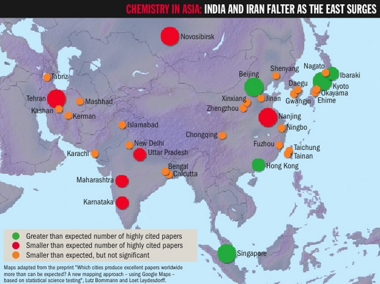 Loet Leydesdorff, professor of the dynamics of scientific communication and technological innovation at the University of Amsterdam, and Lutz Bornmann, a "scientist of science" at the Max Planck Society in Munich, have used data from the Sciverse Scopus citation database to generate maps of research activity.